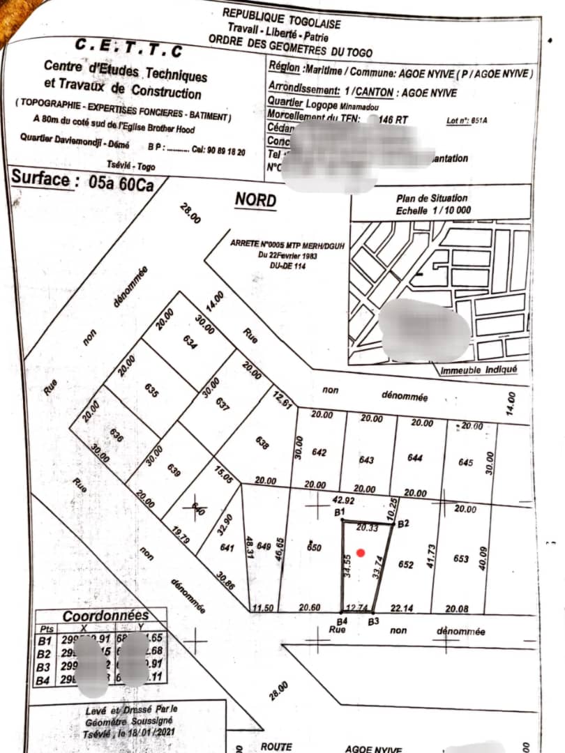 Baguida-AfanoukopéTerrain 1 lot ( soit 560m2 ) avec titre foncier .... Très bien situé en plein centre ville en milieu Résidentiel , non loin de la station d'essence TOTAL et de l'université ESA à 350m du goudron réliant Agoè Assiyéyé à 2 lions ...