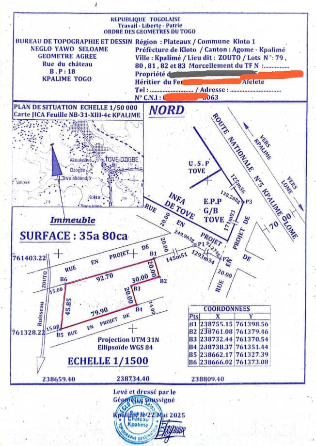 Baguida-AfanoukopéTerraon 6 lots collés avec 3 tampons + Droit de Propriété ... tres bien situés juste derrière l'Ouest-Nord de l'INFA de Tové du coté Proche du célèbre Hotel 30 Aout de kpalimé...