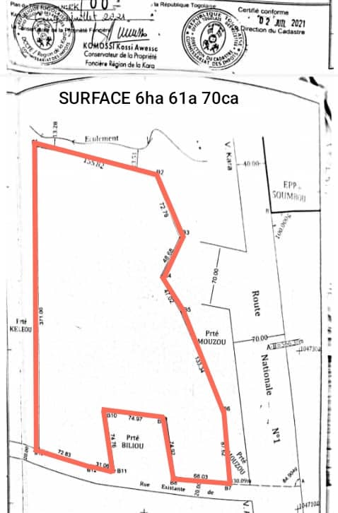 Baguida-AfanoukopéTerrain 6.5 hectares collés avec titre foncier ... tres bien situés dans la préfecture de la Kozah non loin de Cimtogo et de la station CAP SOUMBOU à 500m du goudron de la nationale bnuméro 1 à Kara AWANDJELO..