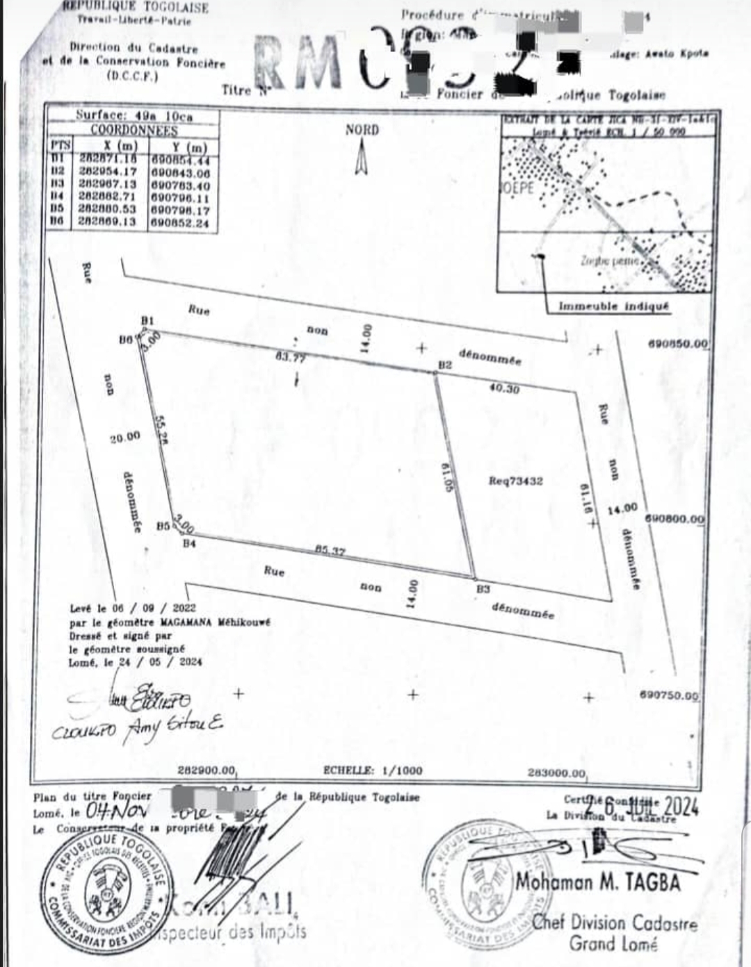 Baguida-AfanoukopéTerrain 8 lots collés avec titre foncier .. bien situés à environ 1km du goudron à noépé juste derrière la Résidence du Ministre EDEM KODJO ...
