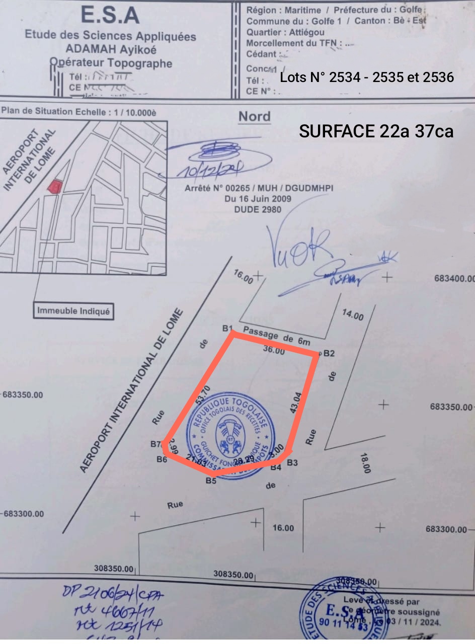 Baguida-AfanoukopéTerrain 3 lots 3/4 collés avec un nouveau tampon OTR.... très bien situés en plein centre ville en angle de 4 différentes voies en Bordure du goudron à Attiégou est .... un emplacement stratégique pour toute activité commerciale....