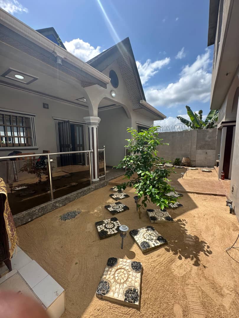 Nouvelle villa construite sur terrain démi lot avec un nouveau tampon OTR... tres bien située juste avant le nouveau péage à 800m du goudron Lomé-kpalimé et composée de :::