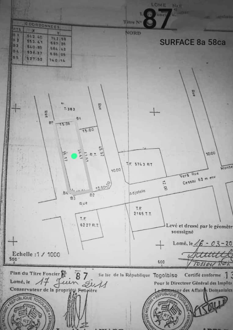 ANEHO-HABITATTerrain 1 lot et démi ( soit 858m2 ) avec titre foncier ... Magnifiquement situé en plein centre ville juste en Face du Lycée Français à moins de 100m du goudron...