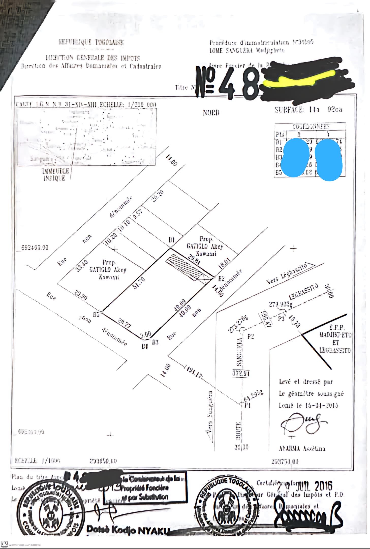 Baguida-AfanoukopéTerrain 2 lots et démi collés cloturés avec titre foncier ( soit 1492m2 ) .... très bien situés en angle de rue ...sur une colline à 400m du goudron du Contournement à légbassito madjikpétpo......