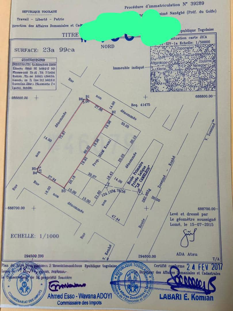 Baguida-AfanoukopéTerrain 2 lots collés avec titre foncier ... tres bien situés à Zossimé nanégbé non loin de l'école primaire CAMELEON en angle de rue et ouverts sur une route de 16m et une autre de 14m dans une bonne position ....