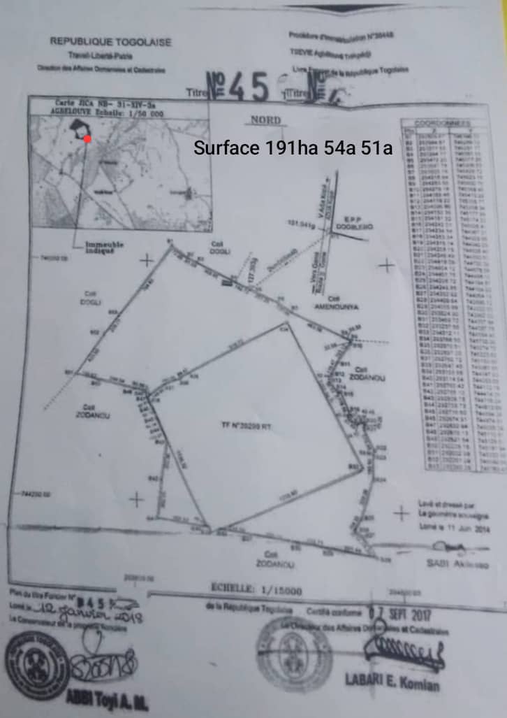 ANEHO-HABITATTerrain Agricole de 191 hectares collés avec titre foncier ... situés à 5.4km du goudron de la nationale numéro 1 à Agbélouvé ...