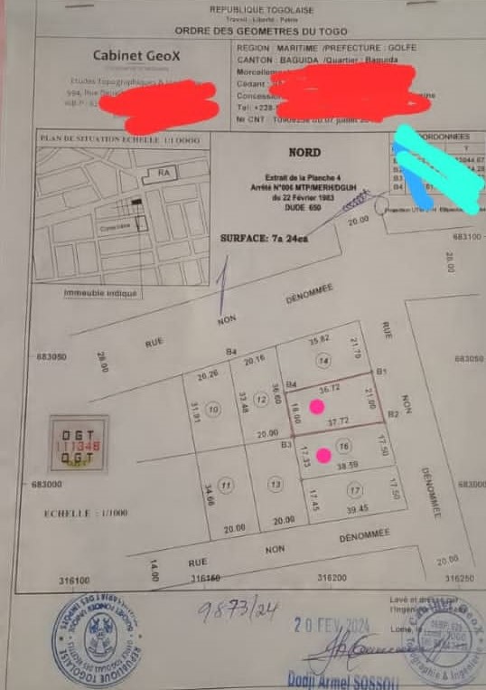 ANEHO-HABITATTerrain 2 lots 1/4 collés avec un nouveau tampon OTR + Avis Favorable ( no 15 et 16 sur le plan ).... très bien situés en Bordure d'une grande voie de 20m non loin du complexe scolaire MAWOUVI...
