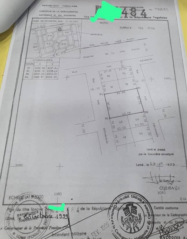ANEHO-HABITATTerrain 2 lots collés cloturés avec titre foncier ... Très bien situés en plein centre ville à Baguida Monument coté non plage juste derrière la cité UEMOA dans un environnement propre à 150m du goudron de la nationale numéro 2 Lomé-Aneho... et ouverts sur 2 voies dévant et derrière ...