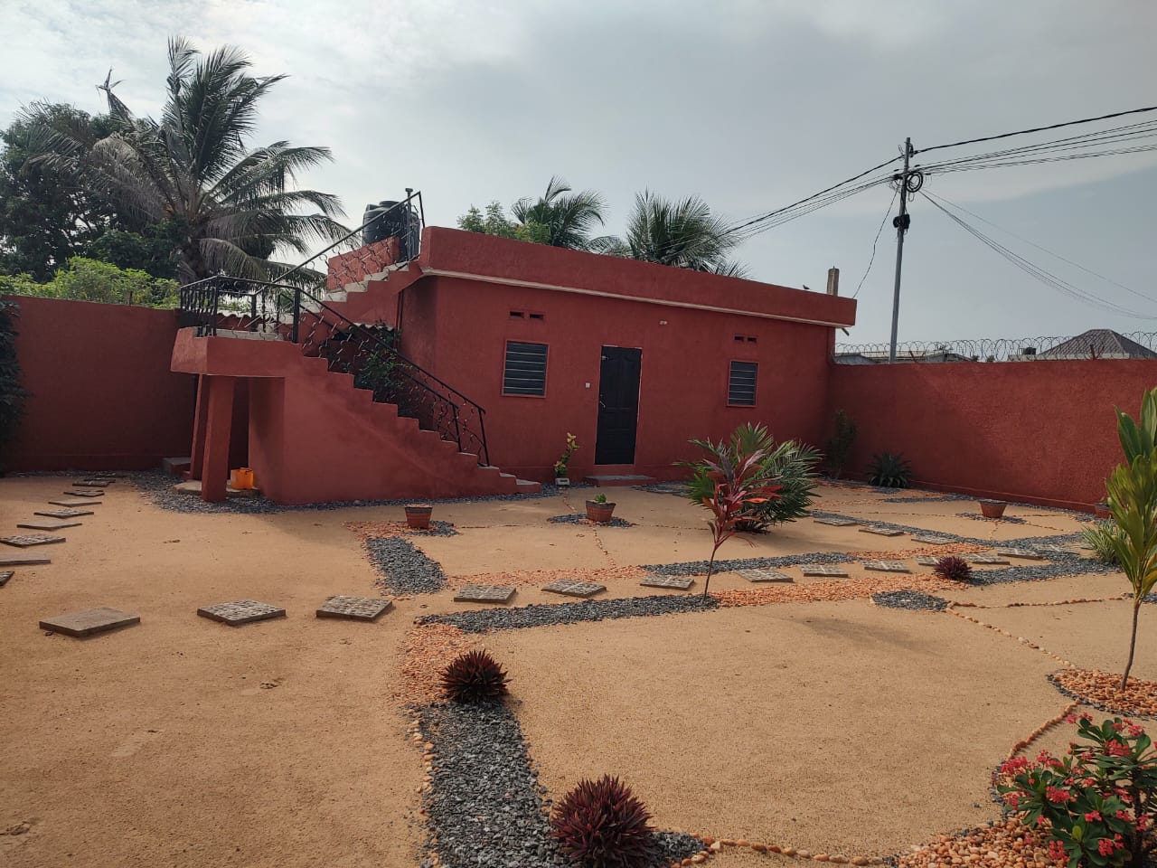 CaisseVilla construite sur terrain 3/4 de lot avec titre foncier en cours .... bien située en angle de rue à kpogan zogbédji, non loin du marché sur la grande voie et composée de :::