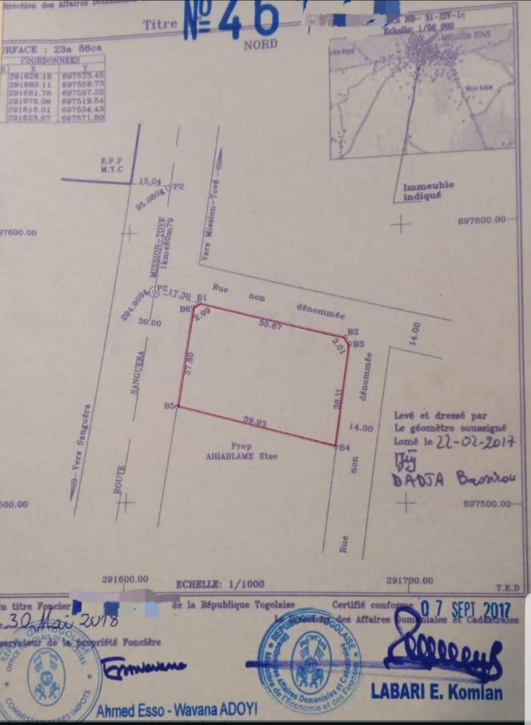 Baguida-AfanoukopéTerrain 4 lots collés avec titre foncier ... bien situés en Bordure de la grande voie de 30m kpala-- Mission Tové à proximité du Bar 2GL et ouverts sur 3 différentes voies...
