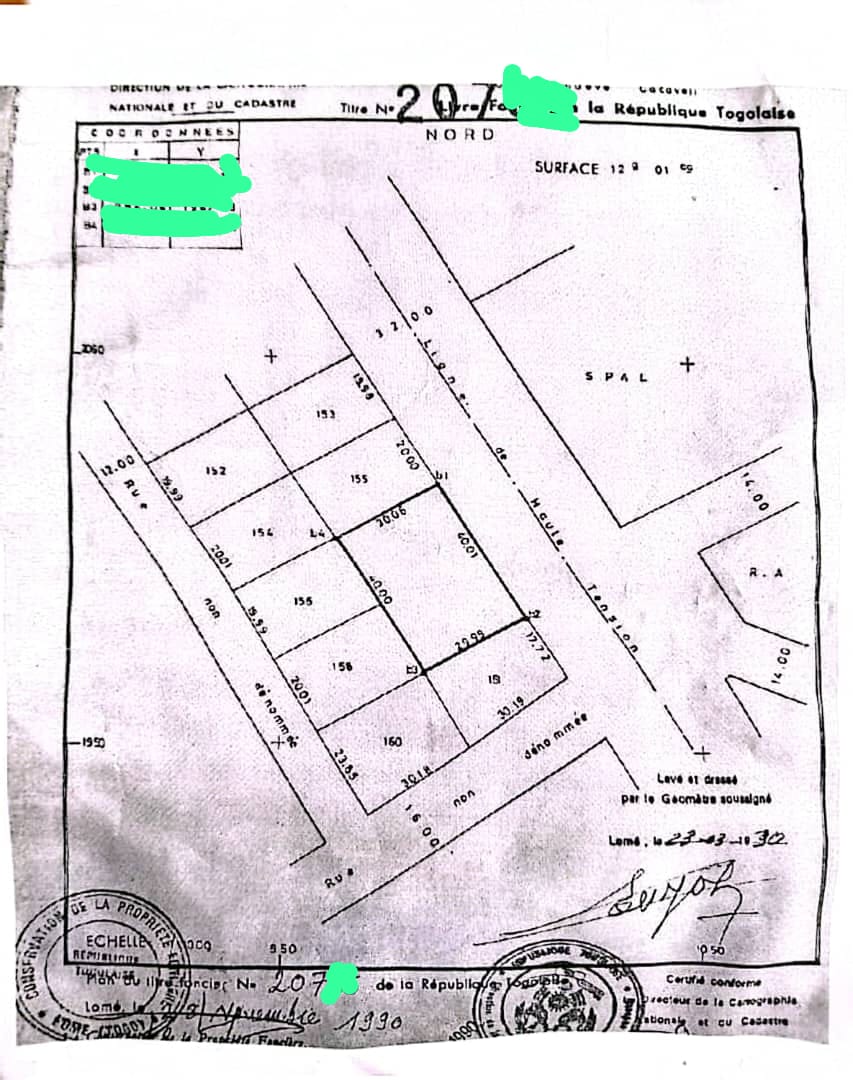 Baguida-AfanoukopéTerrain 2 lots collés cloturés avec titre foncier ... ( soit 1200m2 ) Très bien situés en plein centre ville... tout proche du Siège de BATIR et face à une rue de 20m....