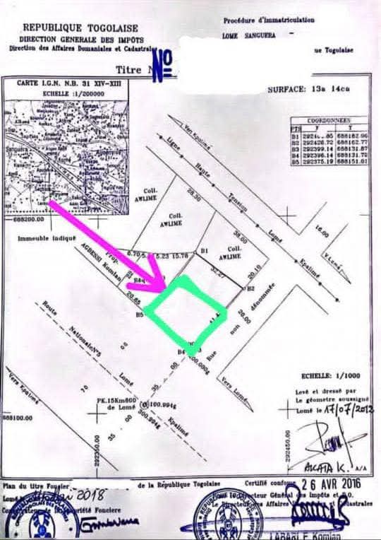 Baguida-AfanoukopéTerrain 1 lot 1/4 avec titre foncier ... Très bien situé en bordure du goudron Lomé-Kpalimé en angle rue avec une ouverture de 28mm/48 et un angle de 20m à Zanguéra avant le Rond point du marché...