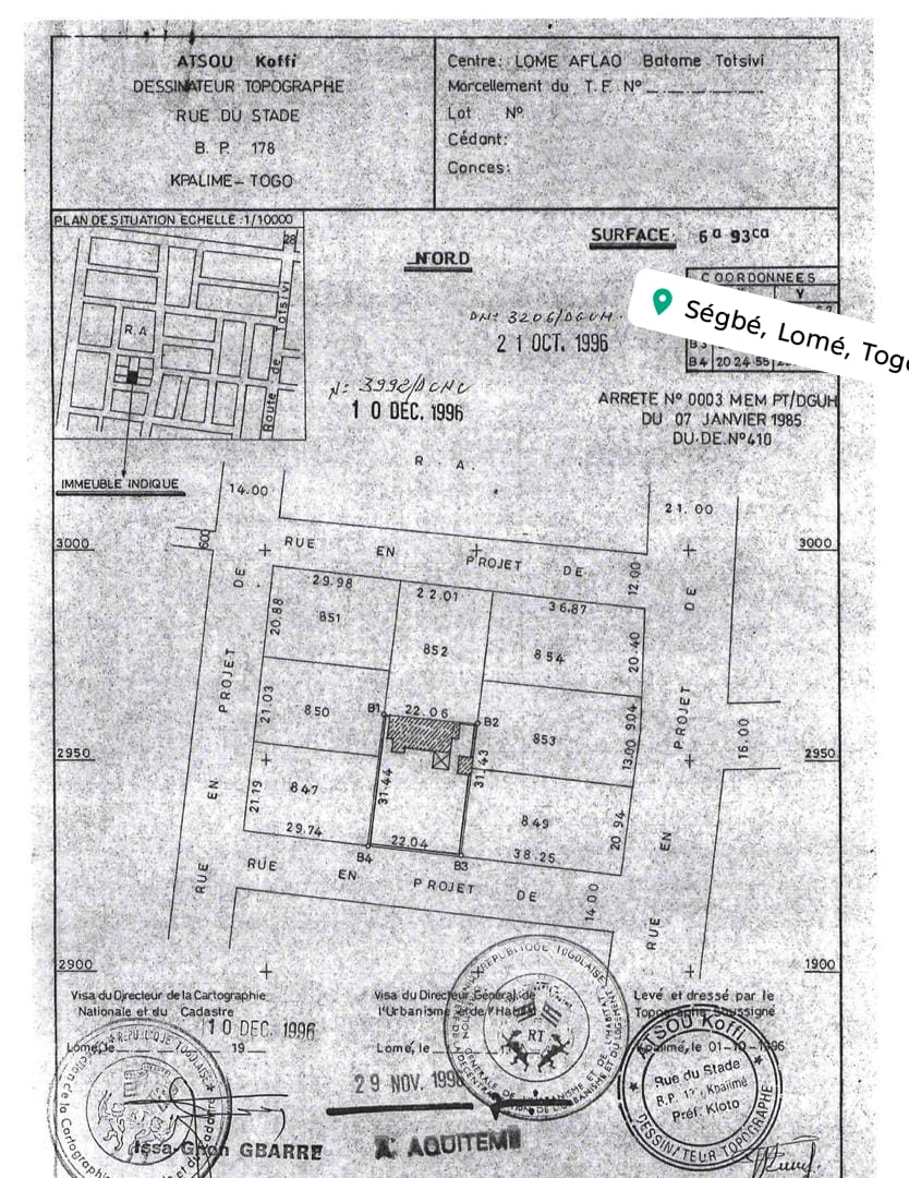 Baguida-AfanoukopéTerrain 1 lot 1/4 ( soit 693m2 ) avec 3 tampons... tres bien situé en plein centre ville non loin de la maison D'Adébayor à 100m des pavés et comportant quelques constructions de chambres anciennes à raser ...