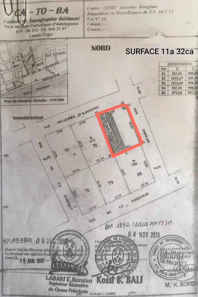 Baguida-AfanoukopéTerrain 1 lot 1/4 ( soit 725m2 ) avec titre foncier ... très bien situés en angle de rue en plein centre du grand marché Assigame ABATTOIR ....