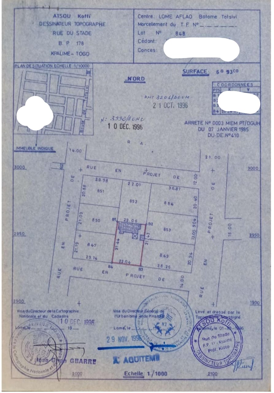 Baguida-AfanoukopéTerrain 1 lot cloturé ( soit 693m2 ) avec 3 tampons ... tres bien situé en plein centre ville non loin de la Résidence D'Adébayor avec une ouverture de 22m et à 30m de la grande voie de 21m aménagée en gravillonnage...