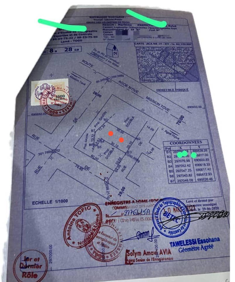 Baguida-AfanoukopéTerrain 1 lot et démi ( soit 828m2 ) avec un nouveau tampon OTR ... tres bien situé sur une voie de 14m , non loin du Carrefour des Etoiles à Agoè Sogbossito ...