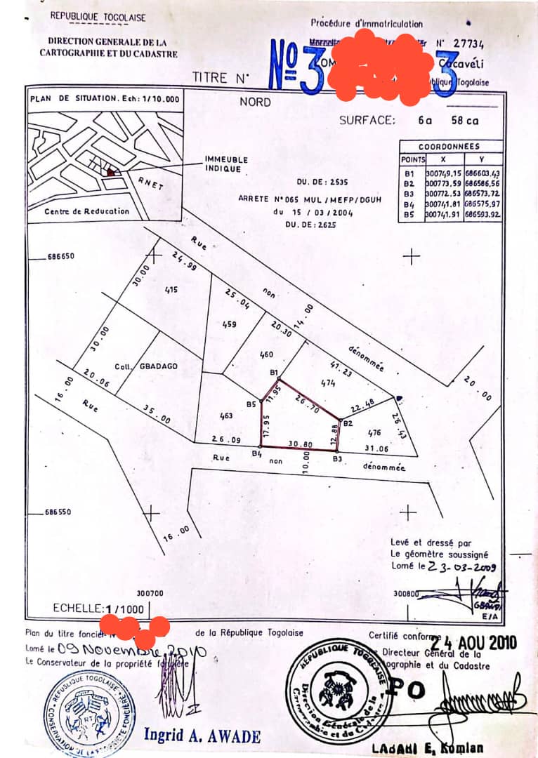 Baguida-AfanoukopéTerrain 1 lot cloturé avec titre foncier ... très bien situé en plein centre ville ( 650m2 ) dans un bon emplacement pour une habitation paisible....