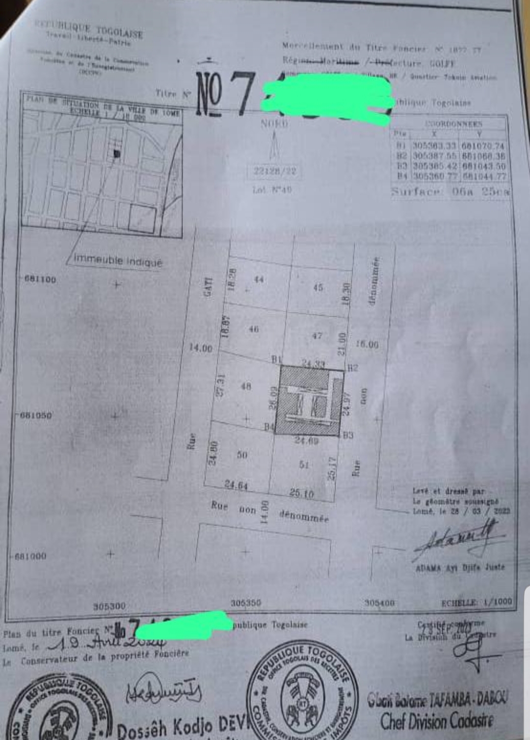 Baguida-AfanoukopéTerrain 1 lot ( 625m2 ) avec titre foncier ....très biebn situé en plein centre ville tout proche de l'aéroport de Lomé et à 100m du goudron.... idéal pour une habitation et commerce...