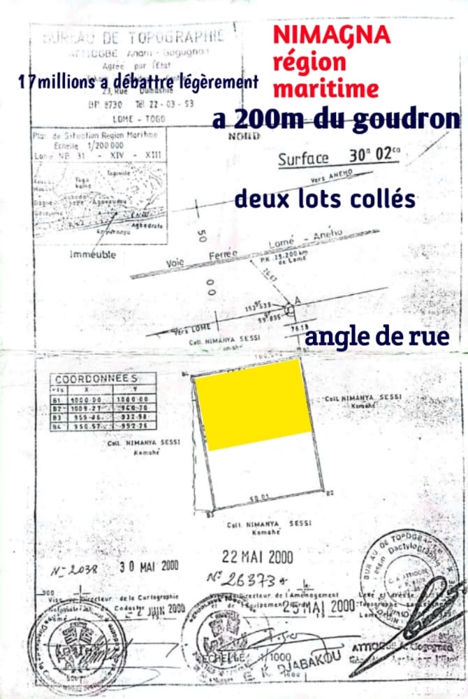 Terrain 2 lots collés avec 3 tampons ... bien positionnés en face de kpéssi et à 200m du goudron de la nationale numéro 2 lomé-Aneho ....