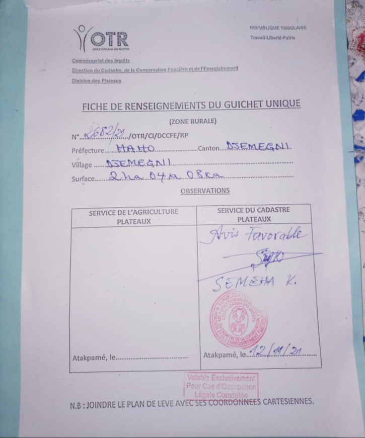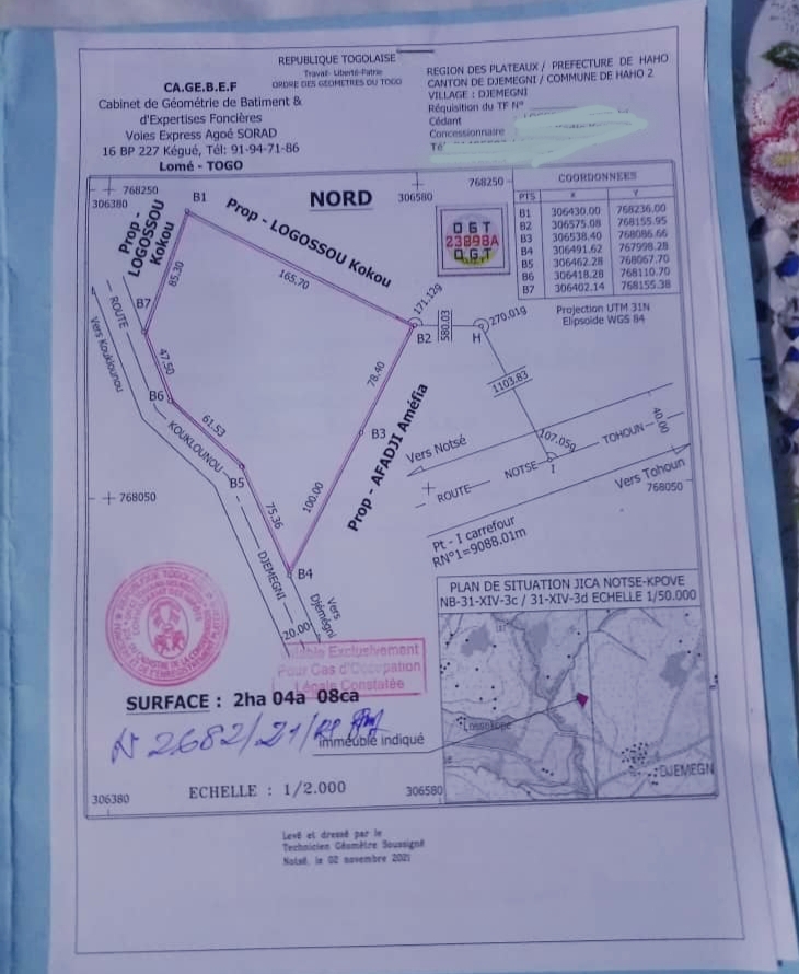 ANEHO-HABITATTerrain 2 hectares ( 2ha 04a 08ca ) Agricole avec Nouveau plan visé OTR avec Avis favorable pour le titre foncier ... Tres bien situés dans la préfecture de Haho ( Canton :: Djémégni ) à 10km de notsè en allant vers TOHOUN juste après le Péage .... Prix à discuter légèrement ....