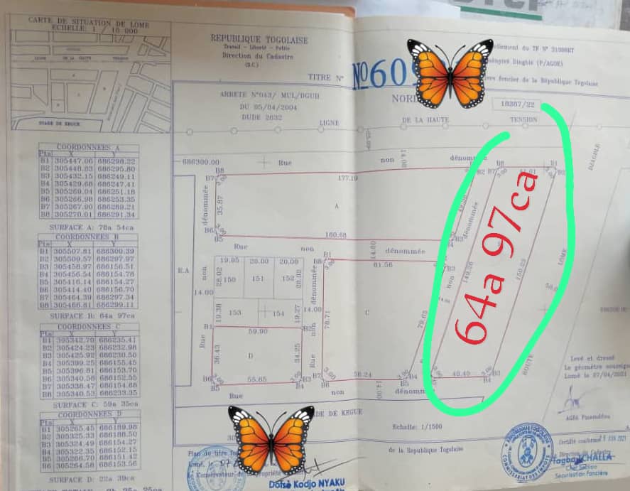 ANEHO-HABITATTerrain Stratégique de 11 lots collés avec titre foncier ( soit 64a 97ca ) Très bien situés avec ouverture sur 4 différentes voies dont la nationale numéro 34 (§ lomé-Vogan ) ... et le grand boulevard Jean-Paul 2 à kégué non loin du stade ...