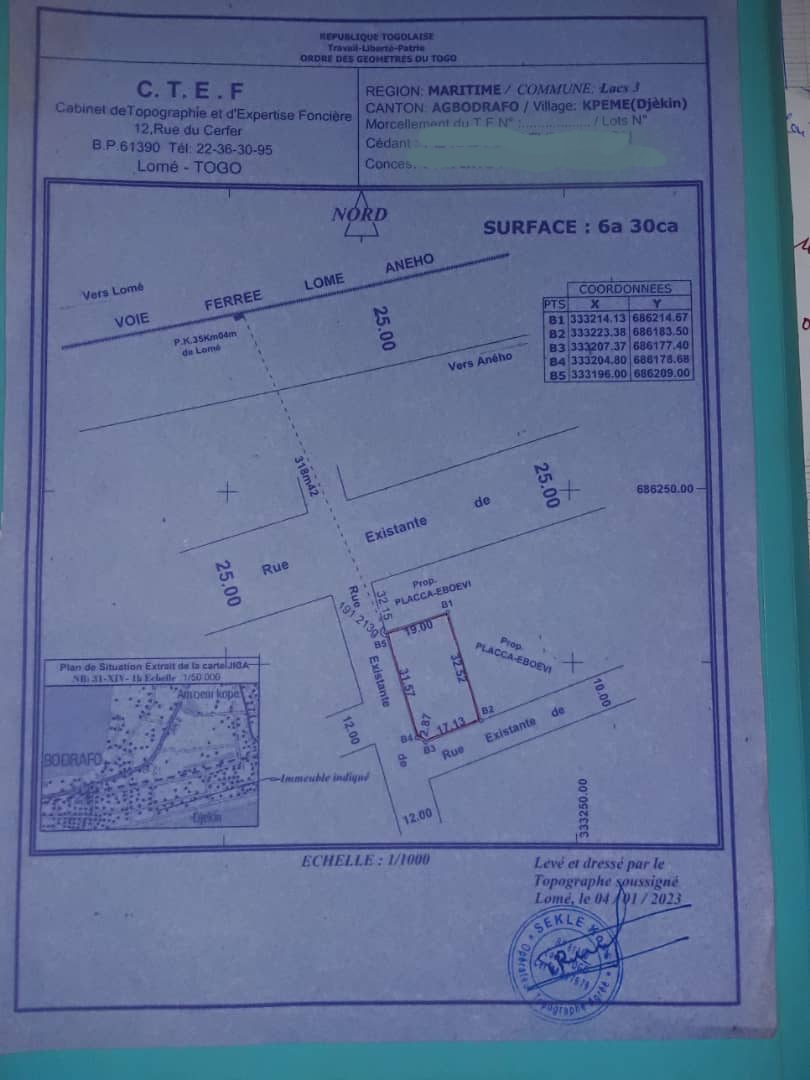Terrain 1 lot ( 6a 30ca ) avec plan lévé + reçu de vente .. situé non loin de la nationale numéro 2 Lom&-Aneho ...