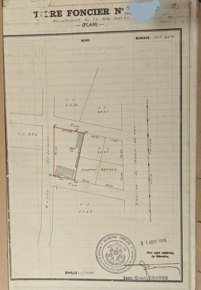 ANEHO-HABITATTerrain 2 lots 1/4 collés ( soit 13a 82ca ) avec titre foncier ... très bien situés en deux angles rue derrière l'ancienne Société de mècha AMINA... et à 200m du goudron tokoin séminaire et tokoin-Ramco ...