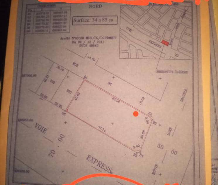 ANEHO-HABITATTerrain Stratégique de 6 lots collés avec titre foncier ... très bien situés en angle de rue en Bordure du goudron du contournement de Djagblé juste au feu rouge ..et ouverts sur 3 différentes voies ...