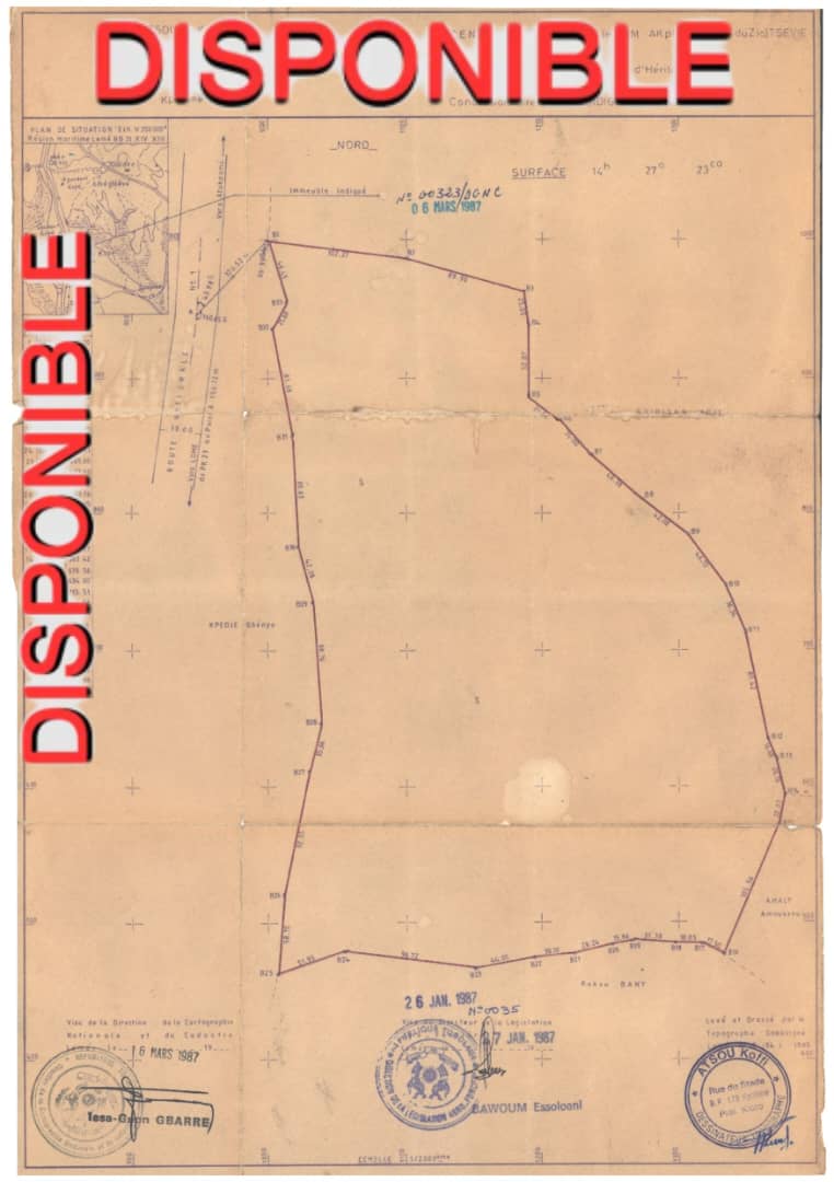 ANEHO-HABITATTerrain 14 hectares collés ( soit 140 lots ) avec 3 tampons ... bien situés à 300m du goudron à coté de l'usine de transformation de sodja à Togblé kopé .... bon emplacement pour toutes activités commerciales ..