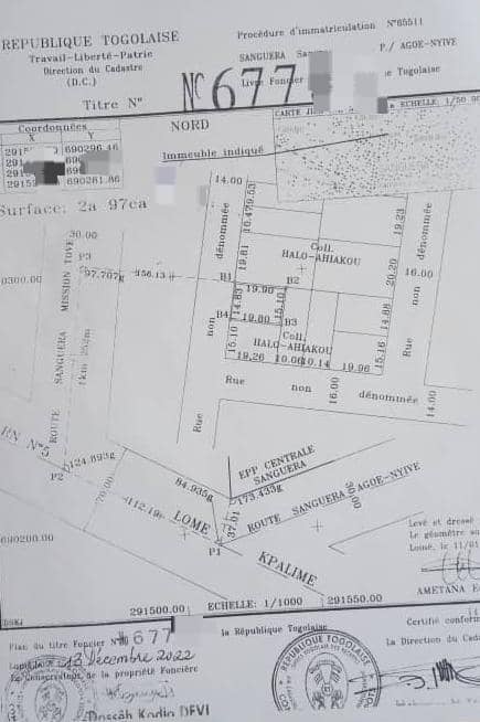 ANEHO-HABITATTerrain démi lot carré ( 15/20 ) avec titre foncier .... tout proche de la pharmacie EVA en allant à klikamé avant la station T-OIL ...