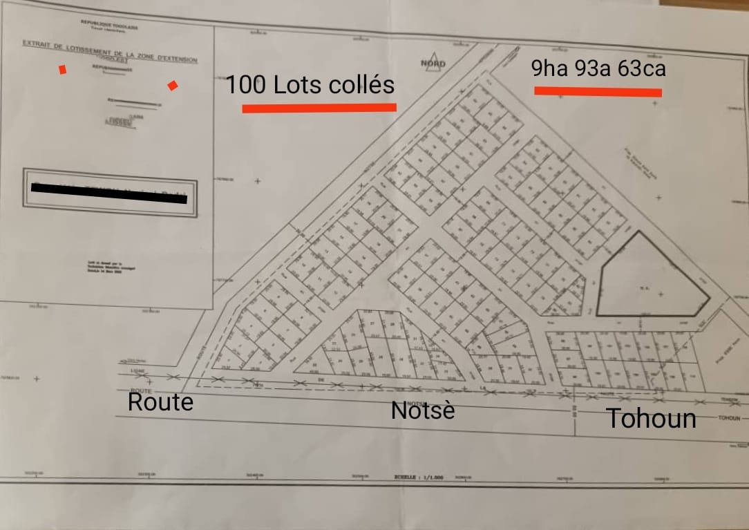 ANEHO-HABITATTerrain 100 lots collés ( soit 9 hectares 93a 93ca ) avec titre foncier en cours ( numéro de réquisition déja sorti ) .... situés dans la Région des plateaux , préfecture de haho commune de haho 1 , village de Notsè , exactement à Kpédigni en Bordure du goudron de la route nationale numéro 6 Notsè-Tohoun en allant vers Kpové à 2km de la route nationale numéro 1, ... Terrain bordé par trois grandes voies dont le goudron de la RN6, accès à la haute tension qui longne le domaine facilitant ainsi tout projet industriel de tout genre ... dont une partie est boisée de Tecks ....