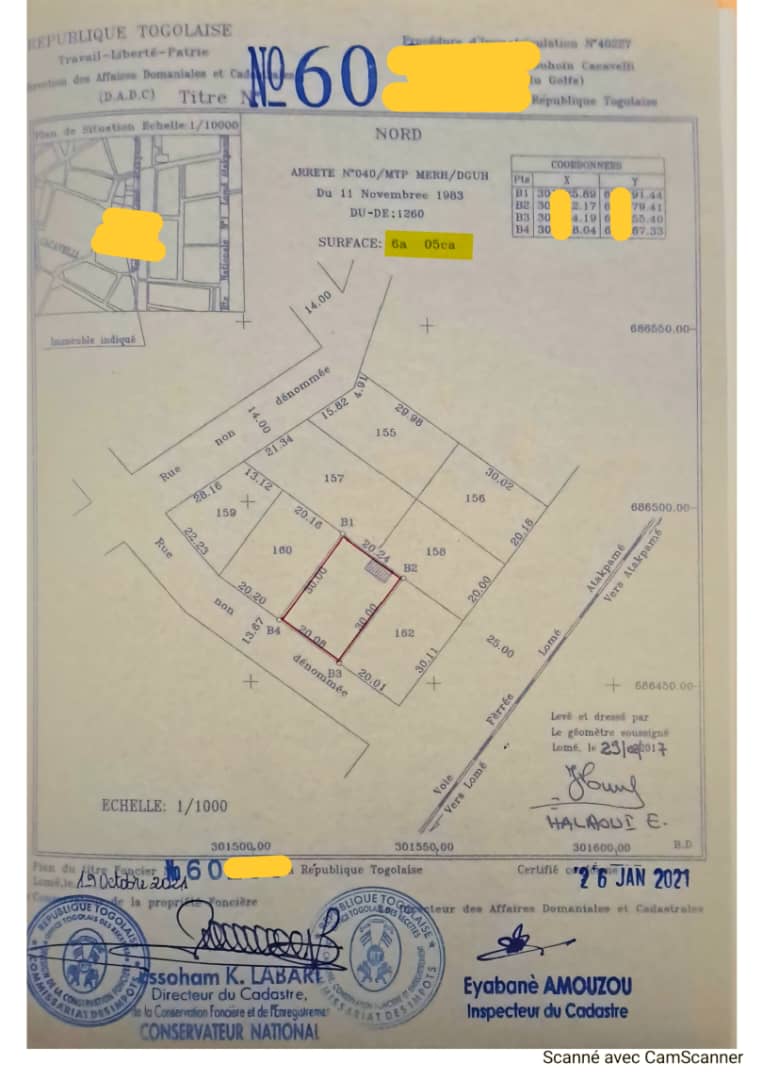 ANEHO-HABITATTerrain 1 lot cloturé avec titre foncier ( soit 605m2 ) ... Très bien situé à 20m des rails tout juste à 250m du goudron de la nationale numéro 1 Lomé-Kara ( Rond-point cacavéli) ... Ceet et Tde disponibles Plus 20 tones de briques inclus dans la vente...