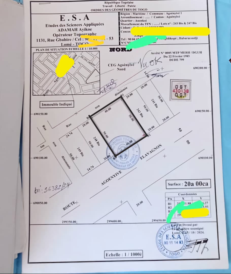 ANEHO-HABITATTerrain 3 lots et démi collés cloturés ( soit 2000m2 ) avec un nouveau tampon OTR + Avis favorable... Très bien situés en face de 2 voies dont la grande voie express de 50m ( en projet de bitumage ) Camp FIR -Entreprise de l'union...