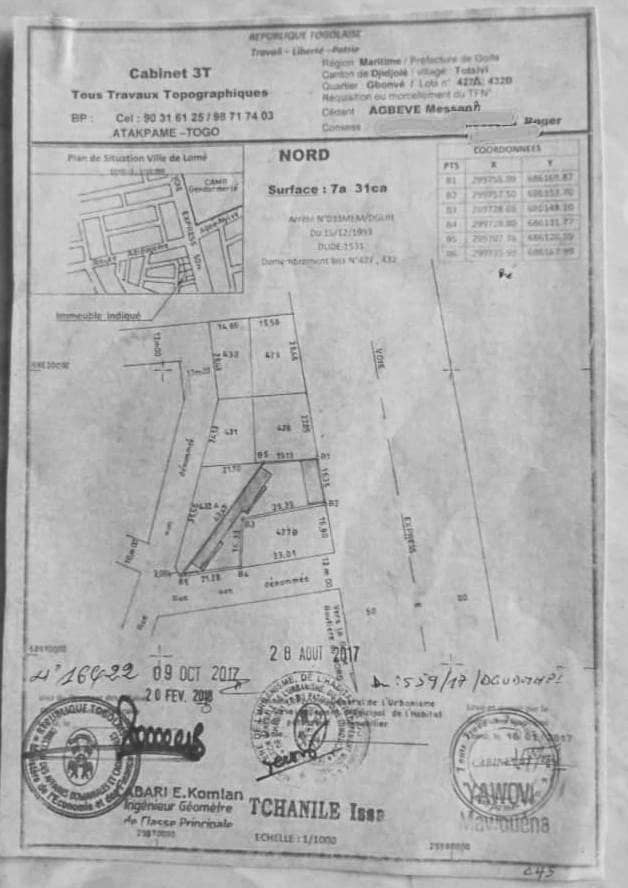 ANEHO-HABITATTerrain 1 lot 1/4 cloturé avec 3 tampons ... ( soit 731m2 ) ... tres bien situé en plein centre ville à Agbalépédo en Bordure du goudron et juste à coté du Carréfour Bodjona... ouvert sur 2 voies et bati de vieilles constructions à Raser au bésoin...