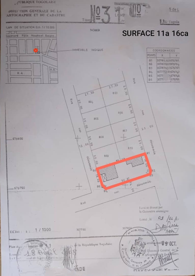ANEHO-HABITATTerrain 2 lots collés cloturés avec titre foncier .. tres bien situés en plein centre ville en angle de rue de 3 diffenrentes voies dont une goudronnée non loin de l'hotel AMBASSADOR et de la pharmacie de OLIVIERS .....