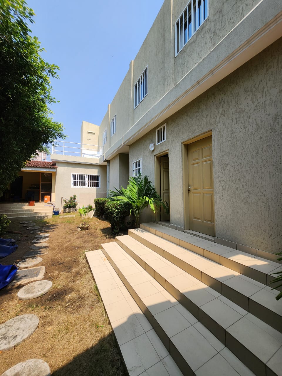 CaisseBelle villa duplex construite sur terrain 1 lot 1/4 ( soit 750m2 ) avec titre foncier ... très bien située en angle de rue en plein centre ville à baguida et composée de :::